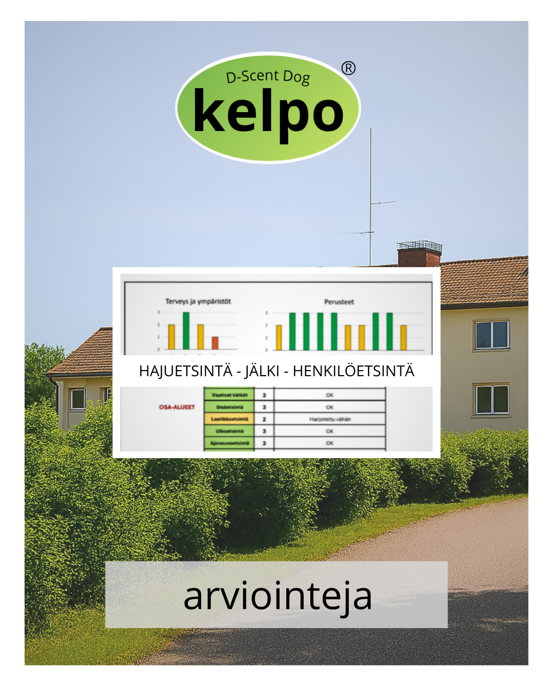D‑Scent Dog tarjoaa kattavan koulutustason arvioinnin, joka antaa selkeän kokonaiskuvan koiran vahvuuksista ja kehityskohteista hajuetsinnässä.