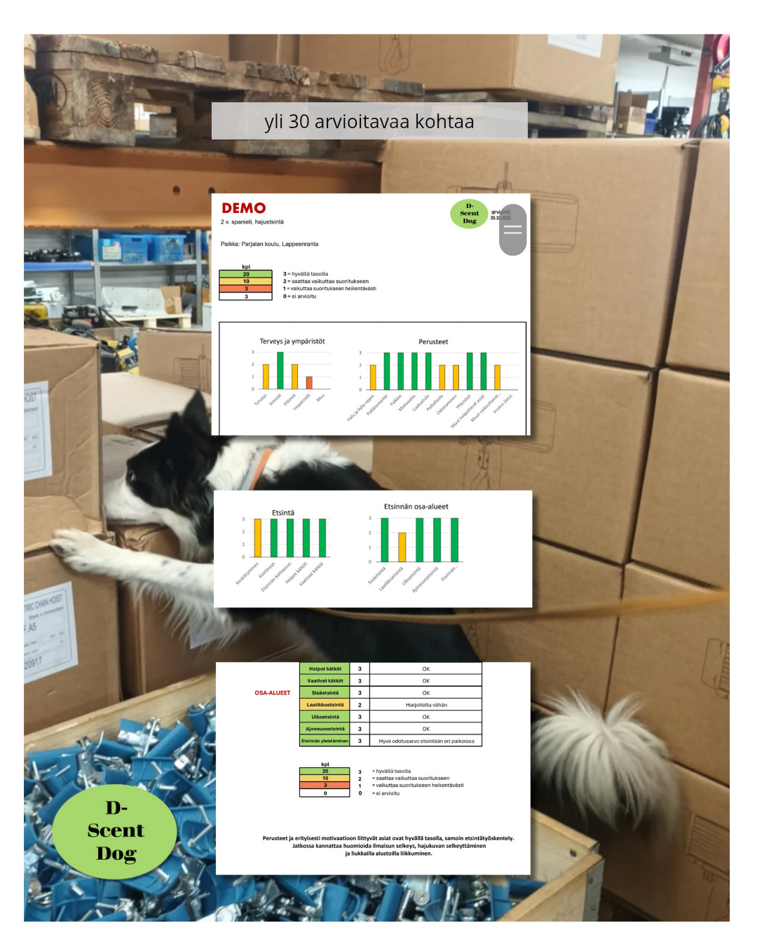 🐾 Kokenut koirien kouluttaja, testaaja ja arvioitsija Tero Väänänen tarjoaa kattavaa koulutustason arviointia, joka antaa selkeän kuvan koiran vahvuuksista ja kehityskohteista, sekä soveltuvuudesta hajuetsintään.